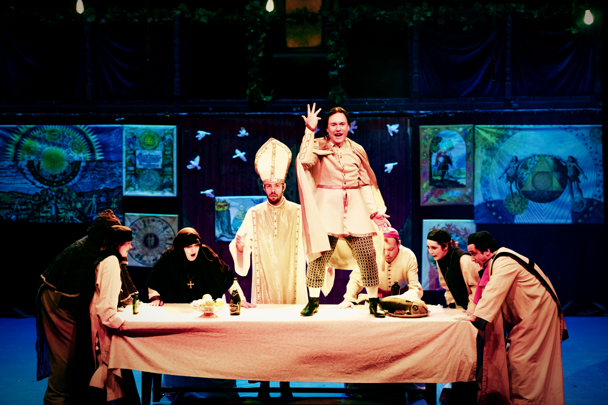 Период написания "Доктора Фауста" это время расцвета елизаветинского театра и невероятного интереса к сверхъественному. Существует две основных версии текста - издание 1604 года и 1616 года. Они сильно разнятся. В более позднем издании, на котором основан наш спектакль, добавлено много комических сцен (буффонада с Папой Римским, фокусы при дворе императора), что делает пьесу более «народной», но, по мнению критиков, нарушает высокий трагический строй .